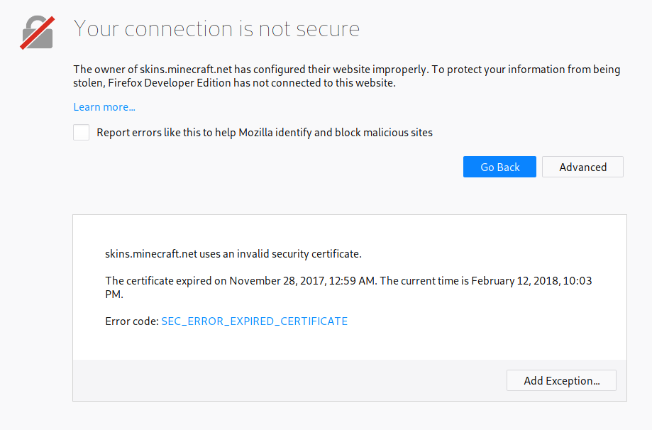 Just like it previously was the case with education.minecraft.net (WEB-934), the SSL certificate for skins.minecraft.net ran out on November 28, 2017.